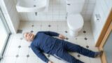 介護施設の洗面スペースに立つ男性高齢者の様子。排泄介助や入浴介助を行う前の場面を想定したイメージで、トイレ誘導・更衣介助・転倒予防など高齢者ケアにおける安全配慮の重要性を示す写真。