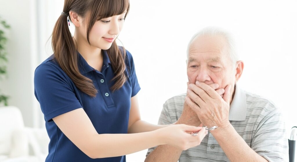 食事中のムセに悩んでいませんか?それはオーラルフレイルのサインかもしれません。道具不要のチェック法と、吹き戻しなどを使った楽しい予防策で、利用者の「食べる力」を取り戻す方法を解説します。